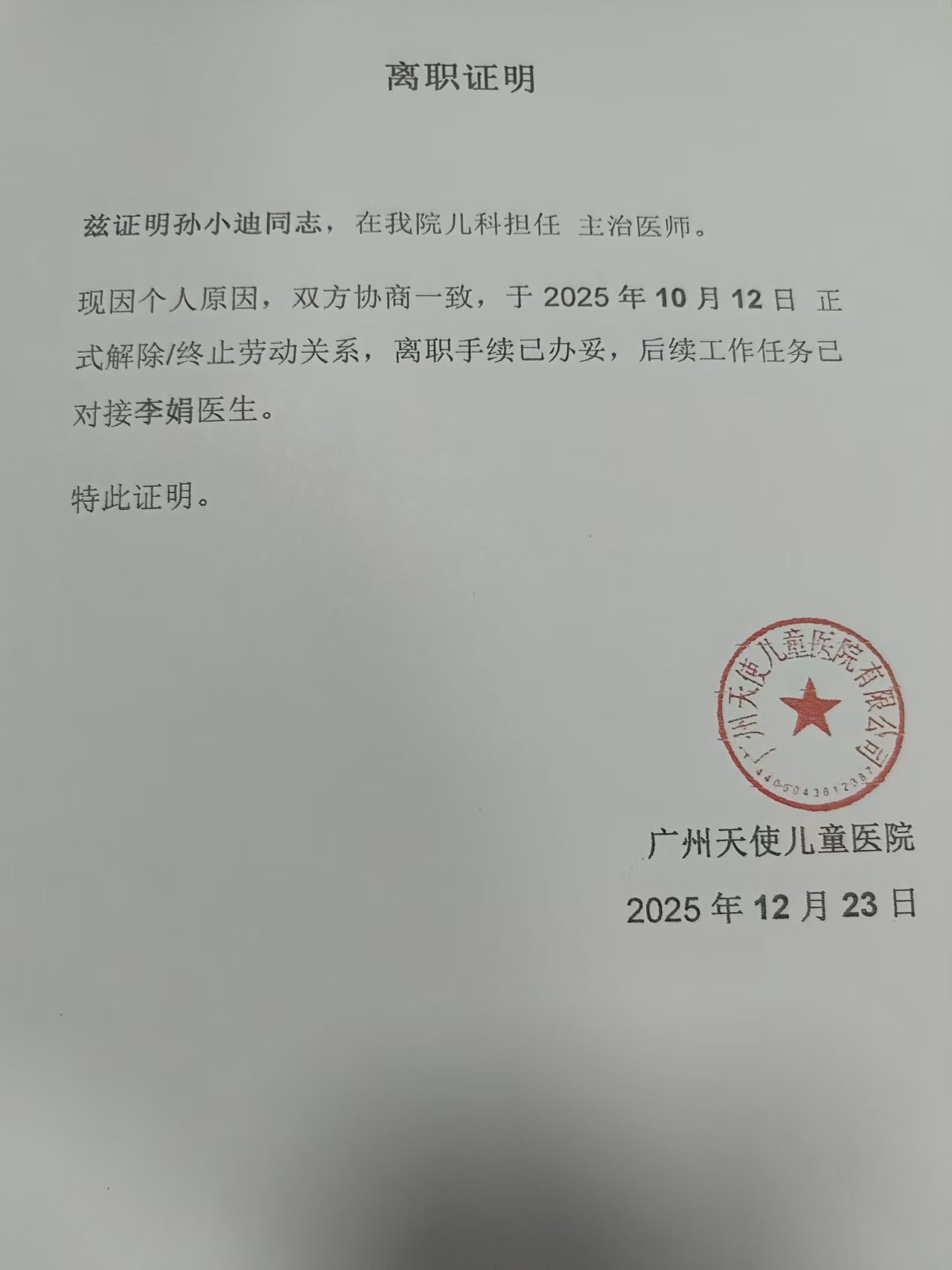 现因个人原因,双方协商一致,于2025年10月12日正式解除/终止劳动关系,离职手续已办妥,后续工作任务已对接李娟医生。